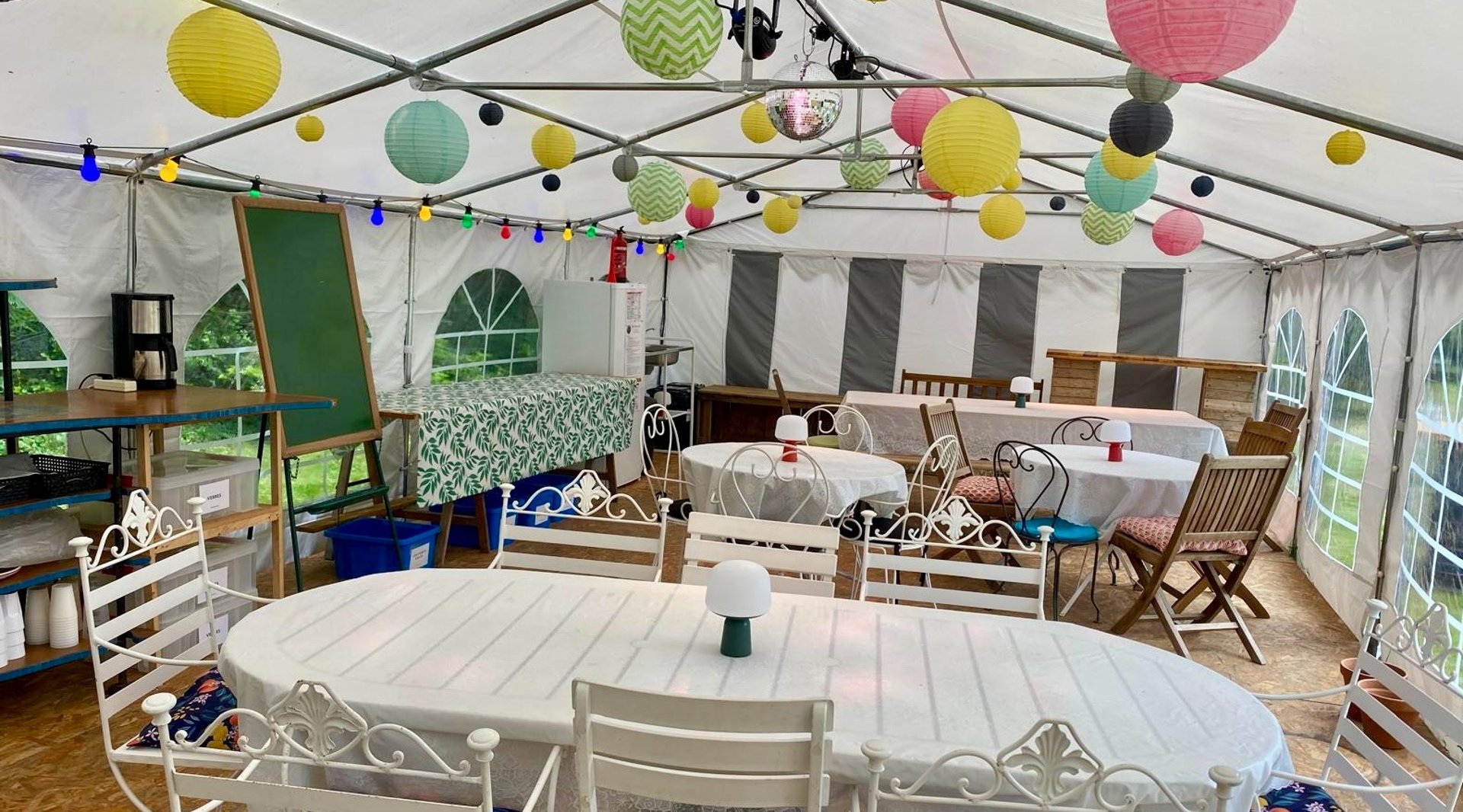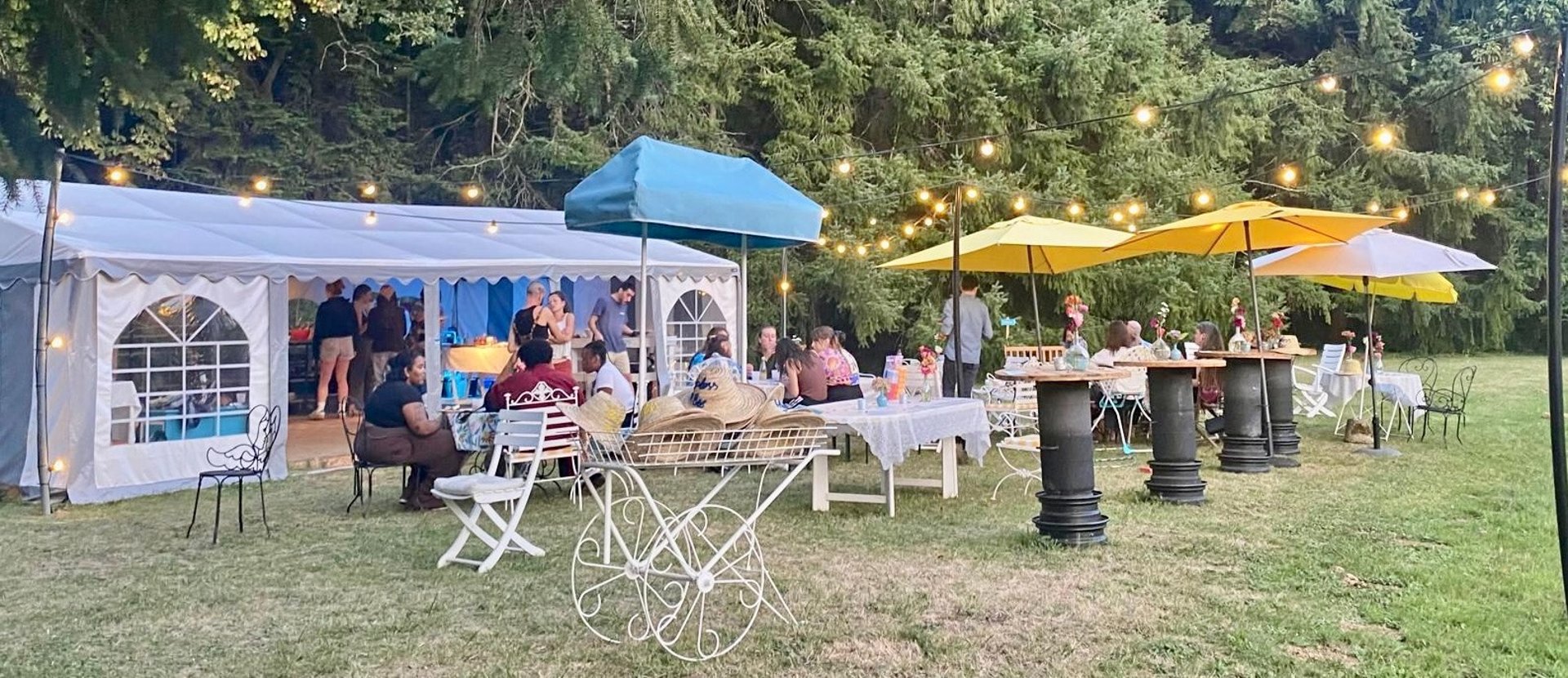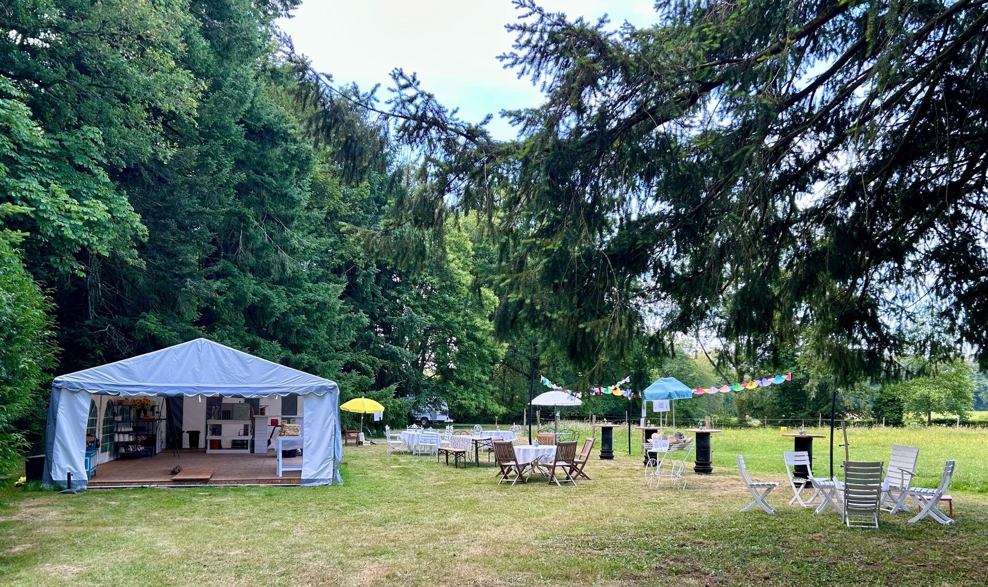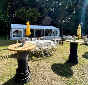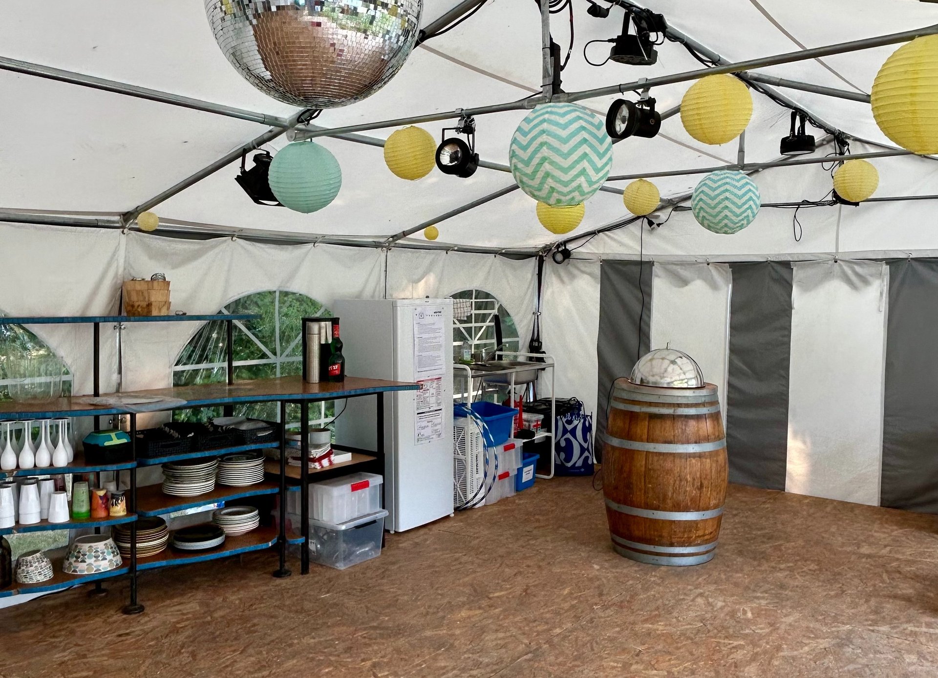 • Tente de réception avec parquet : 35 places assises ou 50 en format cocktail (petits salons de jardin et mange-debout)