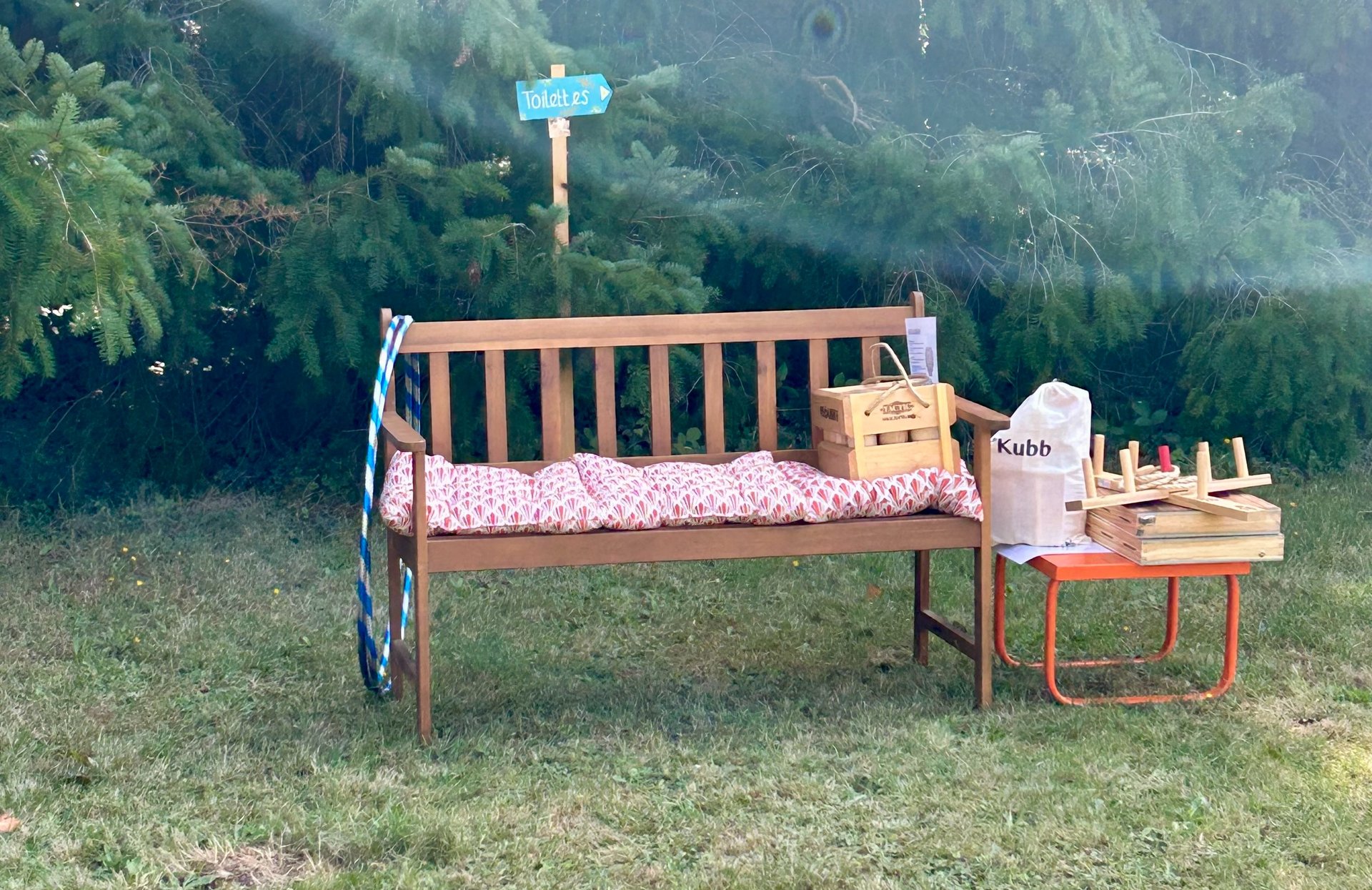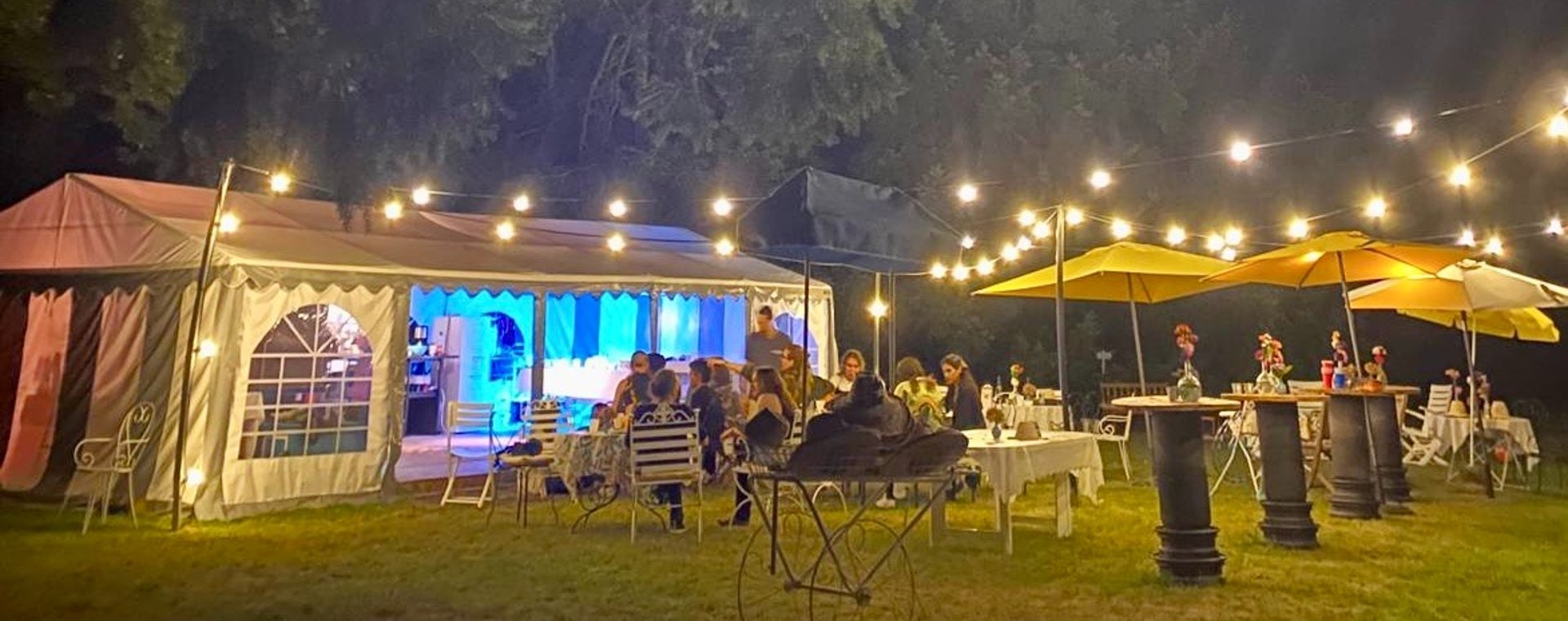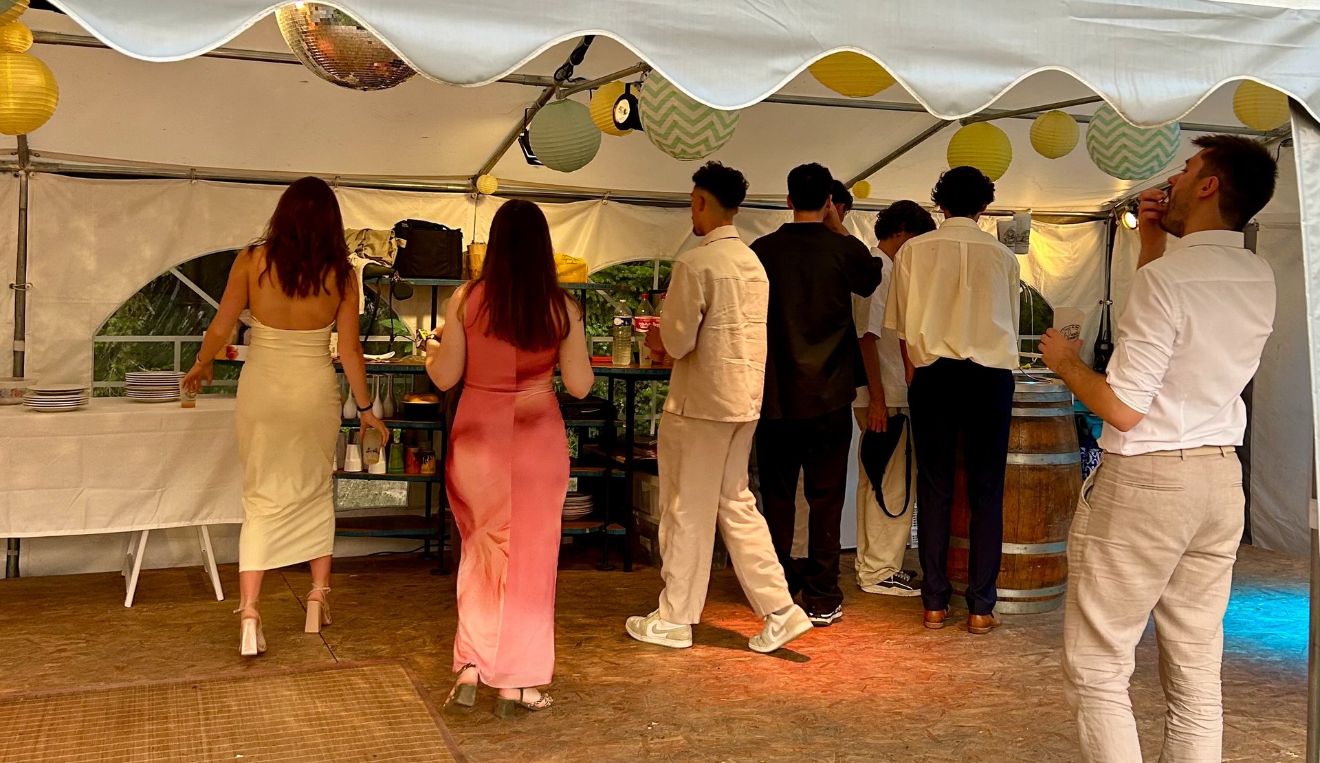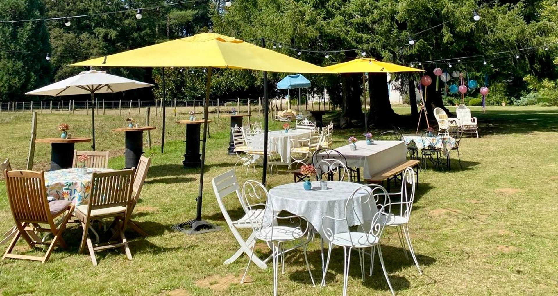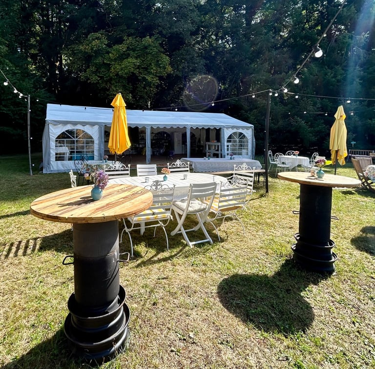• Tente de réception avec parquet : 35 places assises ou 50 en format cocktail (petits salons de jardin et mange-debout)
